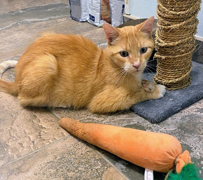 Iām a stunning senior looking for a new family. I got my name when I arrived at the shelter and picked out this lovely carrot to be my constant companion. I am a loving lap cat and I get along with other cats, too. I take a thyroid pill twice a day but I eat it in food and the shelter will help with meds. If you are ready for love, then meet me and take me-and my carrot-home.